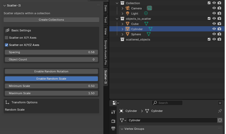- The add-on uses two collections: "objects_to_scatter" and "scattered_objects". The former contains objects the user wants to scatter, while the latter holds the scattered objects.